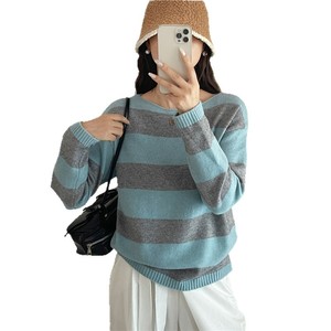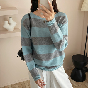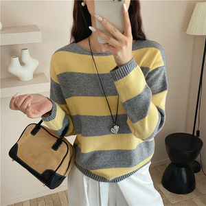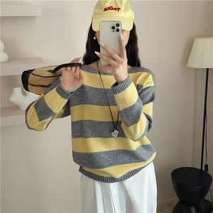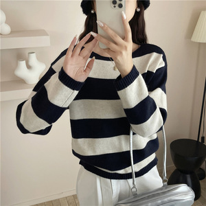 秋装新款法式气质高级小众设计感撞色条纹宽松显瘦圆领针织毛衣女
