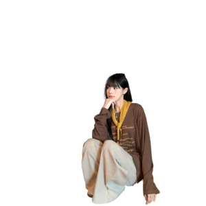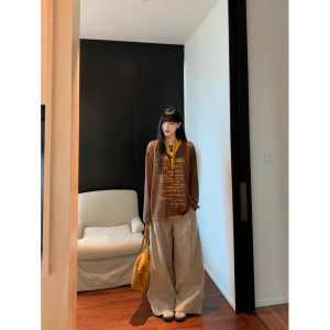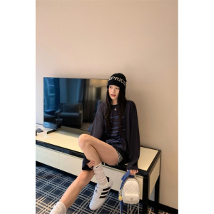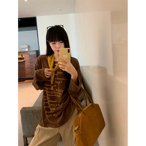 早秋韩系盐系原宿谢谢宽松中长款长袖字母T恤配针织镂空三角巾女