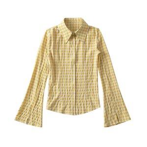 8156-25秋季新款 欧美风翻领单排扣开叉喇叭长袖紧身休闲格子衬衫