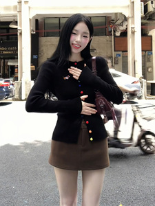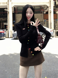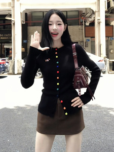 彩虹扣针织开衫女韩系氛围感早秋穿搭上衣巨好看黑色修身毛衣外套