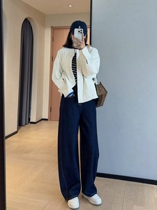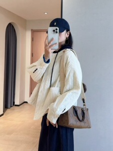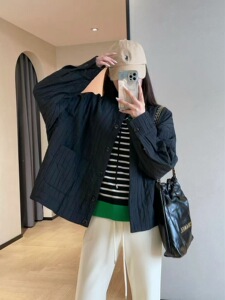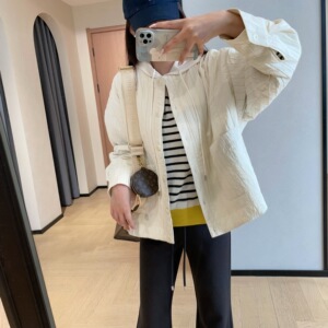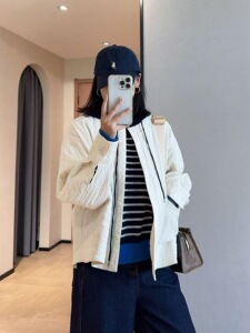 韩系休闲条纹绗绣压花小个子宽松显瘦圆领夹克外套女2025