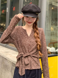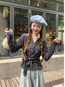 秋季法式复古长袖女收腰显瘦绑带不规则单排扣v领气质新款毛衣女