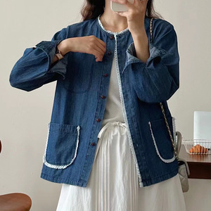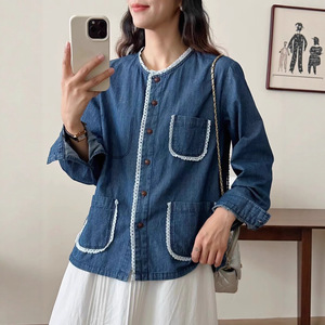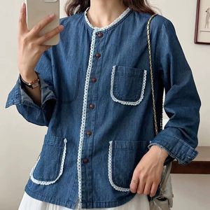 日韩蕾丝花边新款休闲宽松牛仔衬衫女设计感撞色花边牛仔