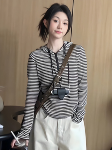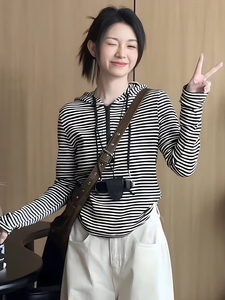 早秋薄款条纹连帽衫短款卫衣女款春秋季2025新款初秋长袖上衣百搭