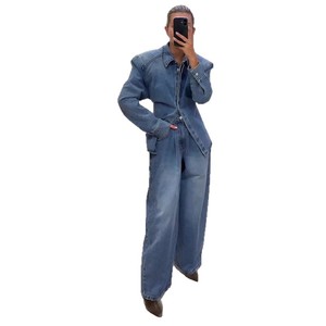 2025秋季新款欧美亚马逊跨境外贸女装显瘦POLO领浅蓝色牛仔两件套