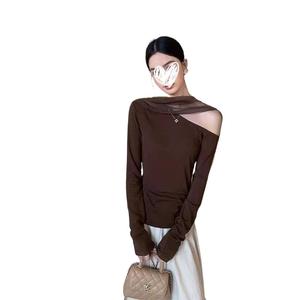 飘带设计纯色不对称斜肩长袖恤女2025秋修身显瘦上衣白色黑色