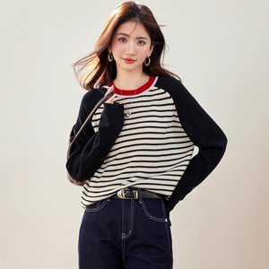 条纹撞色圆领长袖针织衫女2025早秋季新款慵懒风宽松显瘦套头上衣