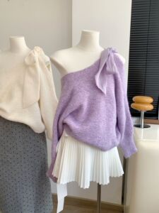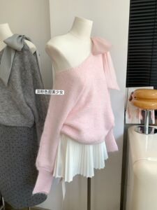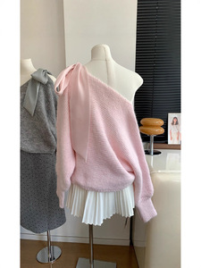 『欣幸』韩系氛围感一字肩毛衣女秋宽松慵懒感简约大轮廓长袖上衣
