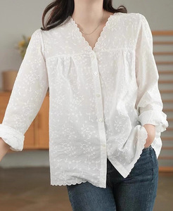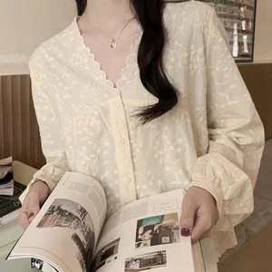 春秋季新款法式V领刺绣蕾丝钩花耳边小衫女单排扣柔软洋气衬衫