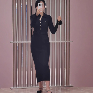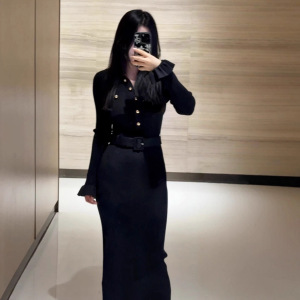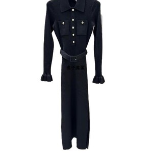 法式优雅2025秋冬季气质千金风喇叭袖腰带长款针织连衣裙