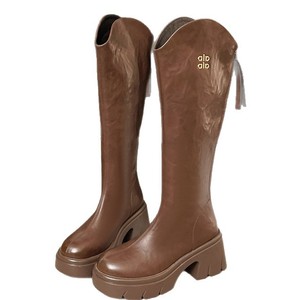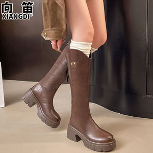 牛皮版V口高跟长筒靴小个子不过膝高筒靴子女厚底粗跟显瘦骑士靴