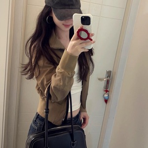 叮叮车美式复古棕色立领夹克外套女早秋季2025新款春秋修身短款拉