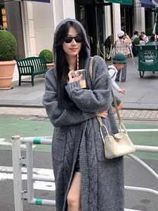 夏诗文 连帽绞花落肩袖针织开衫女秋冬气质慵懒宽松外套