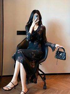 实拍 法式荷叶边喇叭袖碎花雪纺连衣裙气质秋冬系带收腰桔梗长裙