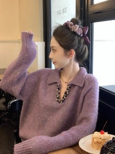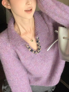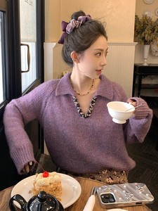 韩系紫色小香风v领毛衣女2025年秋季新款巨好看的多巴胺针织上衣