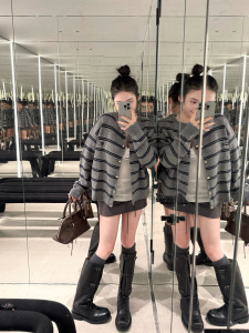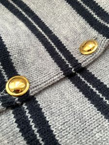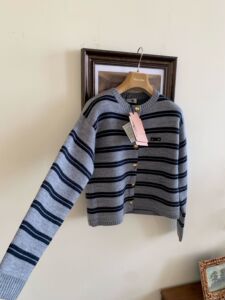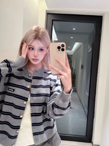 跨境专供 高版本25秋冬羊绒羊毛 Miu风灰黑条纹开衫金扣圆领长袖
