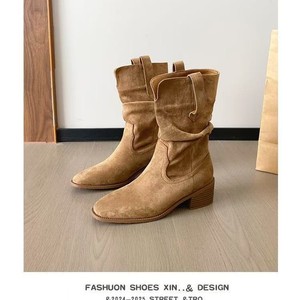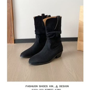 内增高绒面西部堆堆靴女2025新款秋冬复古风小个子粗跟中筒马丁靴