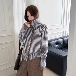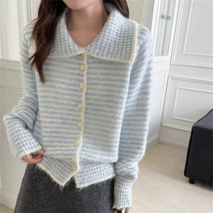 2025秋冬季新款撞色条纹针织毛衣女装开衫翻领文艺复古风宽松外套