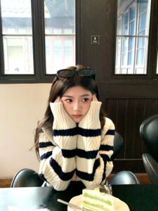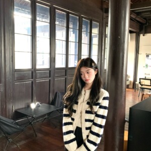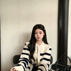 渔渔韩系条纹针织开衫时尚百搭软糯亲肤拼色毛衣女短款