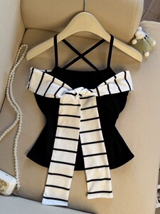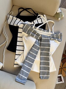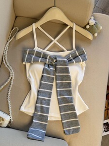 25年韩系条纹飘带拼接一字型钢背心吊带女新款修身收腰辣妹上衣