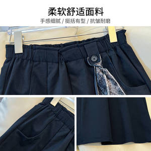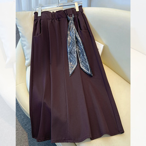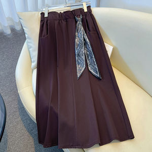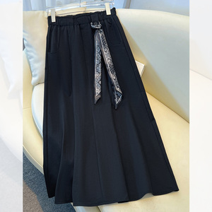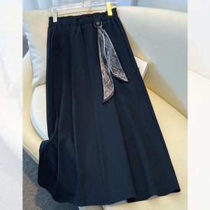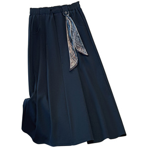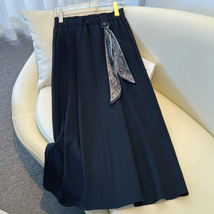 藏青色丝巾腰带伞裙半身裙女秋冬季2025新款高腰中长百褶裙a字裙