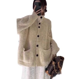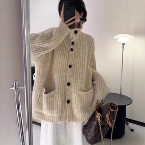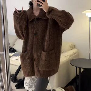 韩系穿搭慵懒风翻领毛衣秋冬新款高级感宽松软糯针织开衫上衣外套