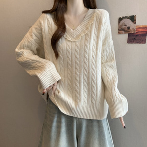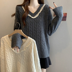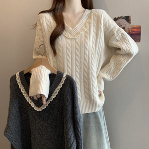 大码女装微胖mm秋冬新款宽松韩版V领蕾丝花边麻花套头毛衣上衣