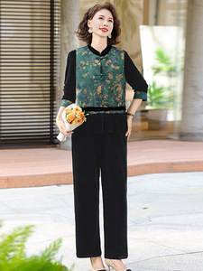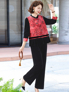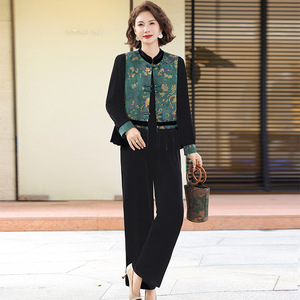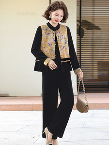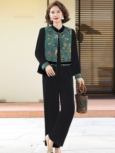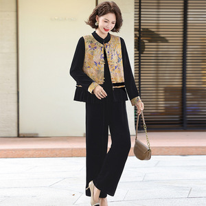批发中老年妈妈新款丝绒套装时尚洋气复古盘扣马甲内搭裤子三件套