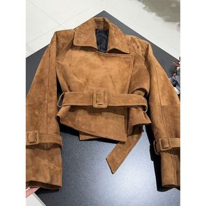韩版复古感纯色翻领夹克上衣2025秋季新款百搭系带设计感外套