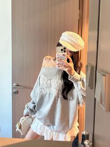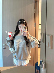 松弛感蕾丝蝴蝶结斜肩卫衣女春秋2025新款宽松慵懒风露肩长袖上衣