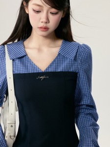 一颗小野莓假两件长袖连衣裙女秋季韩版气质收腰显瘦格子拼接长裙