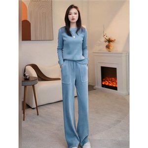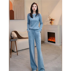 深圳南油盐系轻熟套装女2025秋修身洋气蓝色长袖T恤阔腿裤两件套