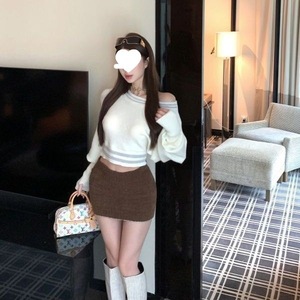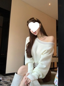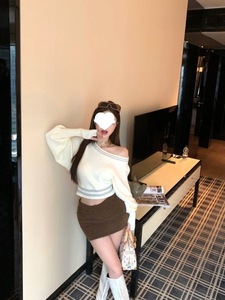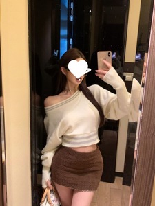 杏色斜肩短款毛衣慵懒风一字肩T恤女秋冬宽松显瘦针织衫新款上衣