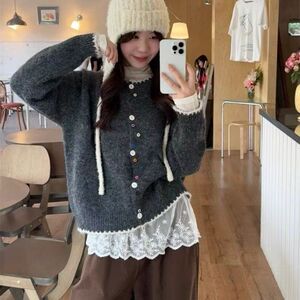 外套韩版彩扣撞色软糯针织开衫2025秋冬新款宽松显瘦圆领毛衣女