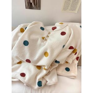 法兰绒睡衣女秋冬季加绒加厚波点套装可外穿珊瑚绒家居服大码冬款