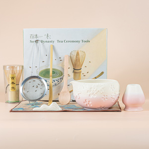 跨境日式带嘴抹茶碗抹茶套装百本立茶筅立渐变粉色抹茶套装茶拨
