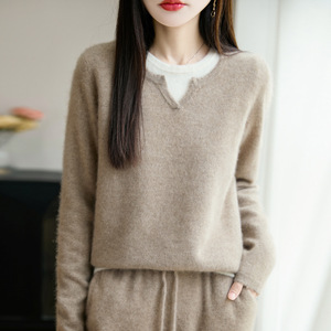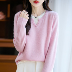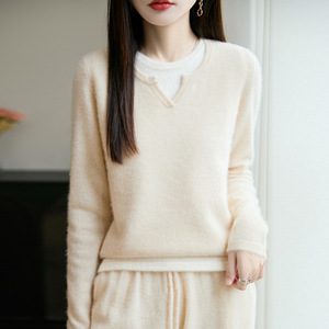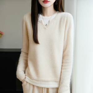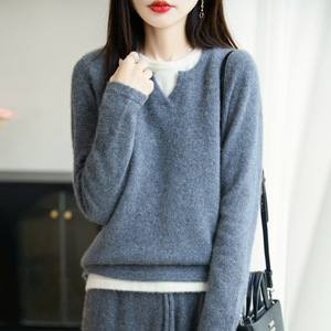 100纯羊毛衫女内搭新款假两件针织拼色毛衣气质女装打底衫上衣