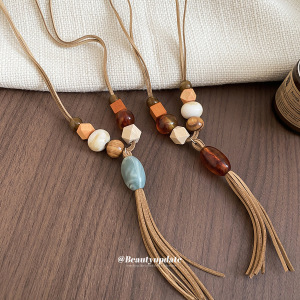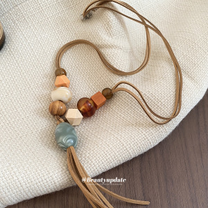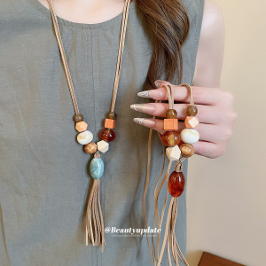韩国绒亚克力木头串珠流苏项链复古民族风锁骨链小众设计感毛衣链