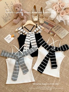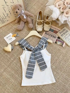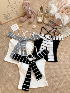 假两件条纹披肩吊带背心女夏季泰式辣妹一字肩抹胸小上衣独特绝美