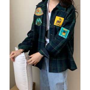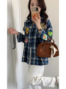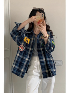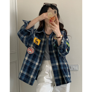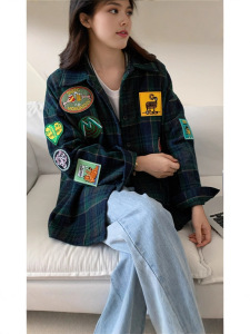 美式格纹长袖贴布衬衫女情侣潮牌工装宽松休闲百搭潮流衬衣外套