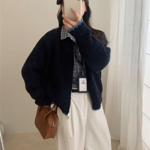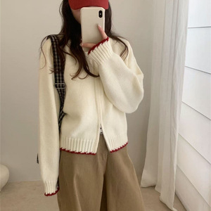 韩系圆领拉链毛衣外套女宽松2025秋冬季季新款撞色边针织开衫外穿