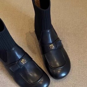 软皮版~圆头山茶花软皮袜靴女短靴法式低跟针织弹力靴百搭瘦瘦靴
