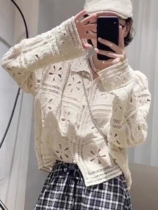 Polo领镂空长袖针织衫重工钩花女2025秋季新款气质显瘦开衫上衣潮