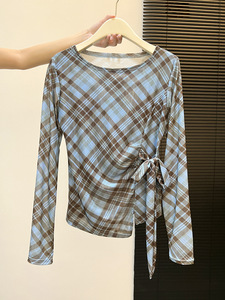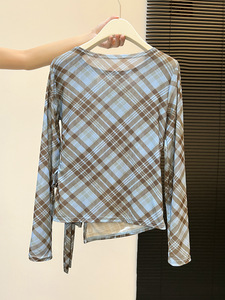 复古格纹撞色印花长袖上衣别致网纱打底罩衫春秋凉感穿搭T恤