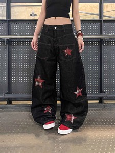 高街嘻哈甜酷星星贴布刺绣反穿牛仔裤女百搭宽松休闲爵士弯刀裤潮