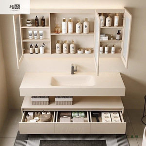 米黄色/白色/鱼肚白岩板无缝盆+智能镜柜-100公分包安装