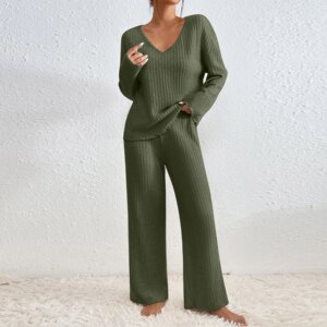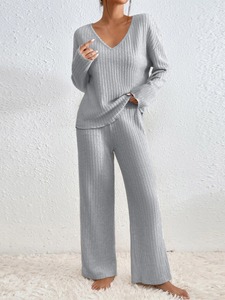 欧美新款亚马逊外贸2025秋冬纯色长袖v领针织坑条磨毛宽松休闲套