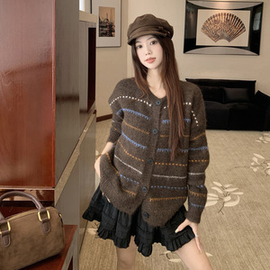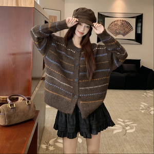 美拉德咖色条纹毛衣外套女2025新款秋冬大码胖mm宽松针织开衫上衣