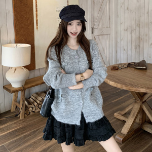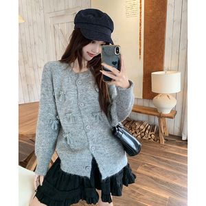 别致设计感灰色蝴蝶结毛衣女秋冬大码短款圆领针织开衫外套