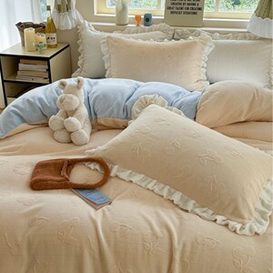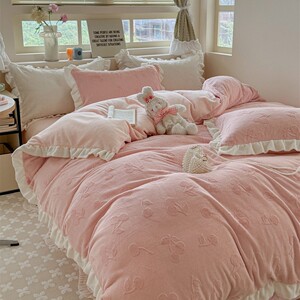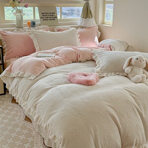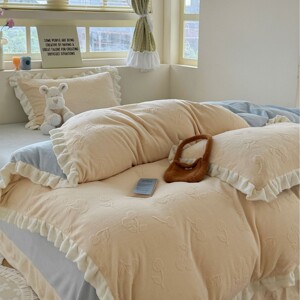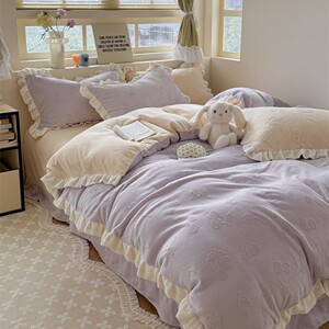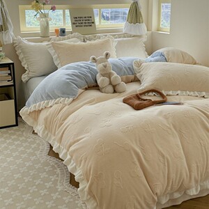 秋冬新款ins风花边牛奶绒雕花四件套公主风保暖加厚被套双面加绒